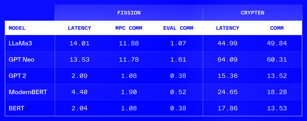 We compared Fission running times against Crypten for various LLMs with sequence lengths 256. We ran LLaMA 3 1B, GPT Neo 1.3B, GPT2, ModernBERT and BERT models. We also reported latency in seconds and communication in GBs. Then, we split the communication for Fission into MPC communication and evaluator communication. We observed that Fission is 3 to 8 times faster than Crypten.