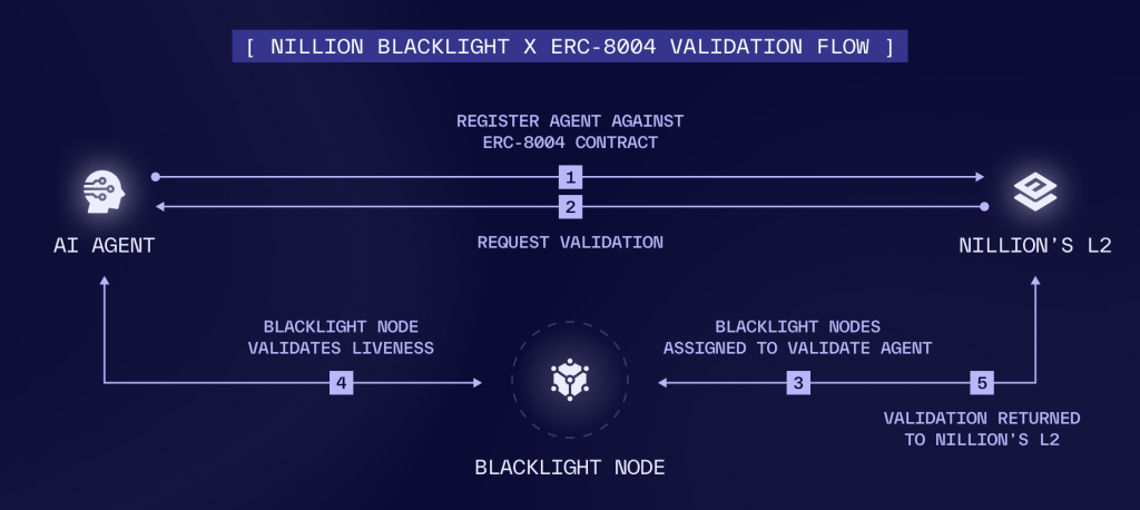 Nillion Blacklight acts as a decentralized, credibly neutral validation layer for ERC‑8004‑registered agents.